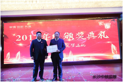 ( 董事长兼总经理梁昕晔先生为荣获中国交通建设监理协会优秀监理工程师的刘金平同志颁奖)